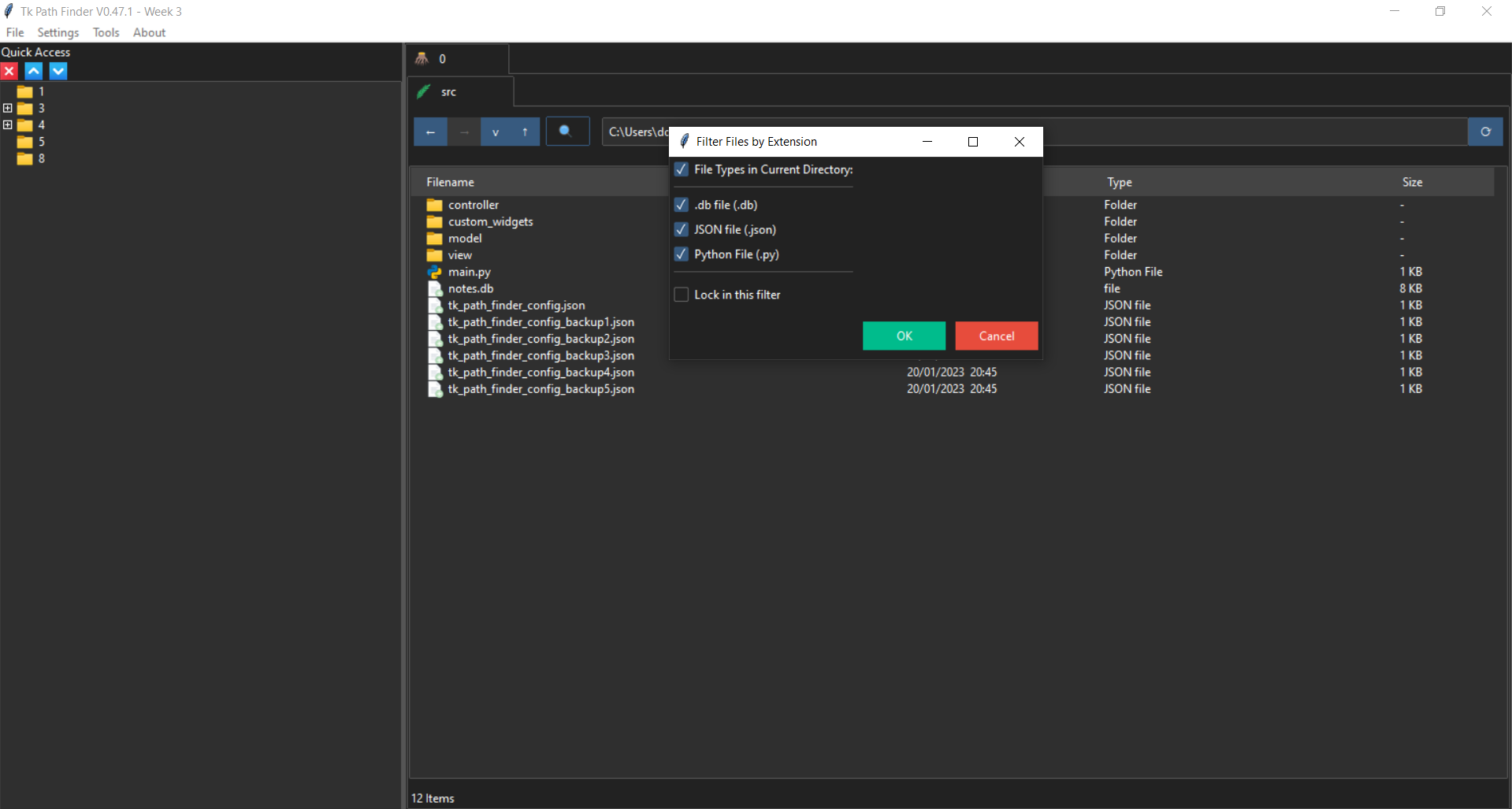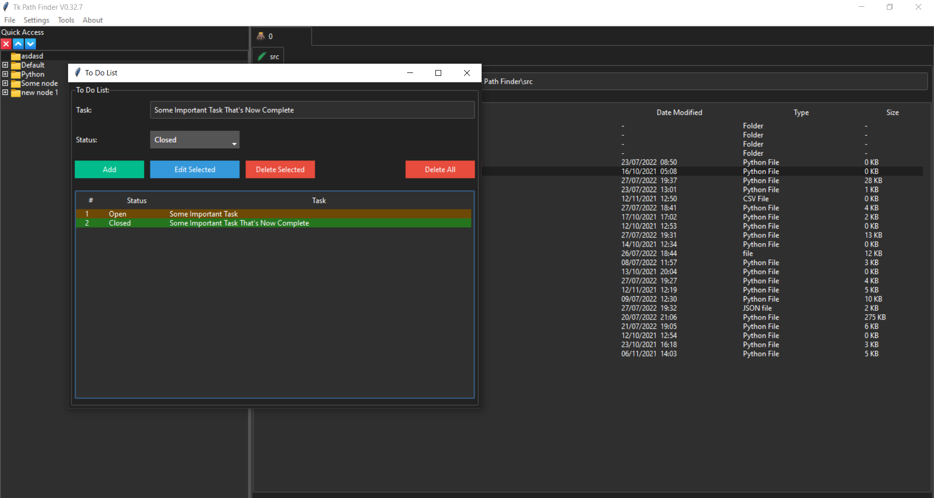 Note the app creates 2 files, "tk_path_finder_config.json" and "notes.db" (sqlite database). These will be created in the default working directory. The json file stores all links and tabs created by the user. Several backups are automatically generated for this file. The database contains any notes entered into the diary.
