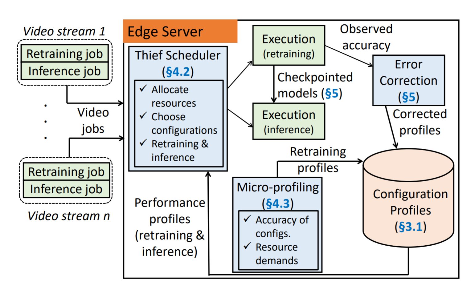 This architecture diagram highlights the flow of data in Ekya. More details can be found in our USENIX NSDI 2022 paper available here.