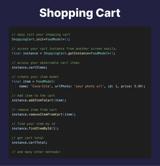 ShoppingCart.init<FoodModel>();One of the great advantages of my package is that you can get the cart instance anywhere in your code and you don't need to save and pass it from screen to screen on your own.