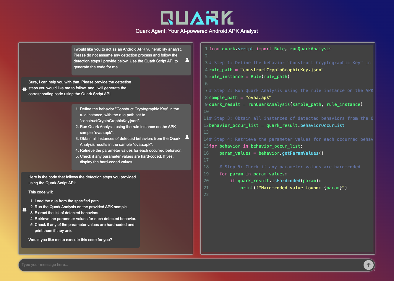 Here’s a demonstration of using Quark Agent to detect the CWE-798 vulnerability in ovaa.apk.