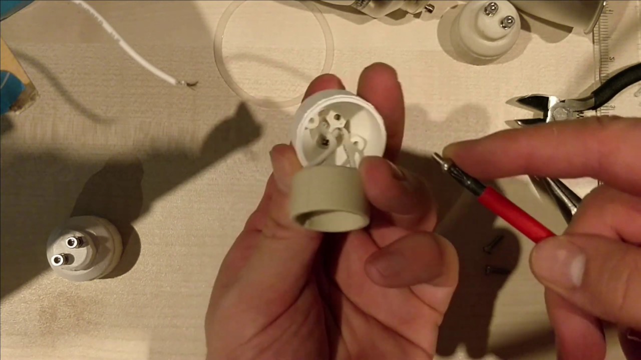 - Cut GU10 socket wires to 4.5cm and skin off 4mm of insulation.