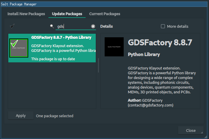 GDSFactoryklayout plugin to be able to see live updates on your GDS files from the klayout GUITools --> Manage Packages --> Install New Packages --> GDSFactory