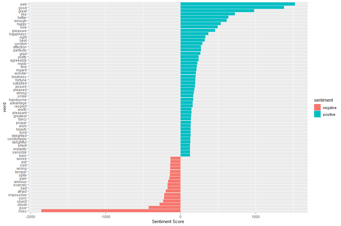 Sentiment Analysis in R on Jane Austen's book Pride and Prejudice for all words used more than 125 times in the book.