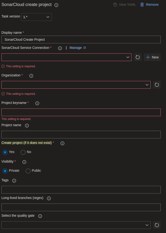 It is recommended to place the task after the task 'Prepare analysis in SonarCloud' of SonarSource, because the purpose of this task is to check if a project exists in sonarcloud and if it does not exist create it according to our configuration.