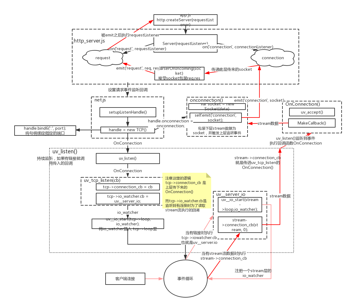 当有连接到来时,底层回调了TCP类的onconnection函数(self._handle.onconnection),并传过来一个 clientHandle,onconnection 把 clientHandle 封装成 socket 对象,并触发 connection 事件,把 socket 传给上层的 connectionListener 监听器。