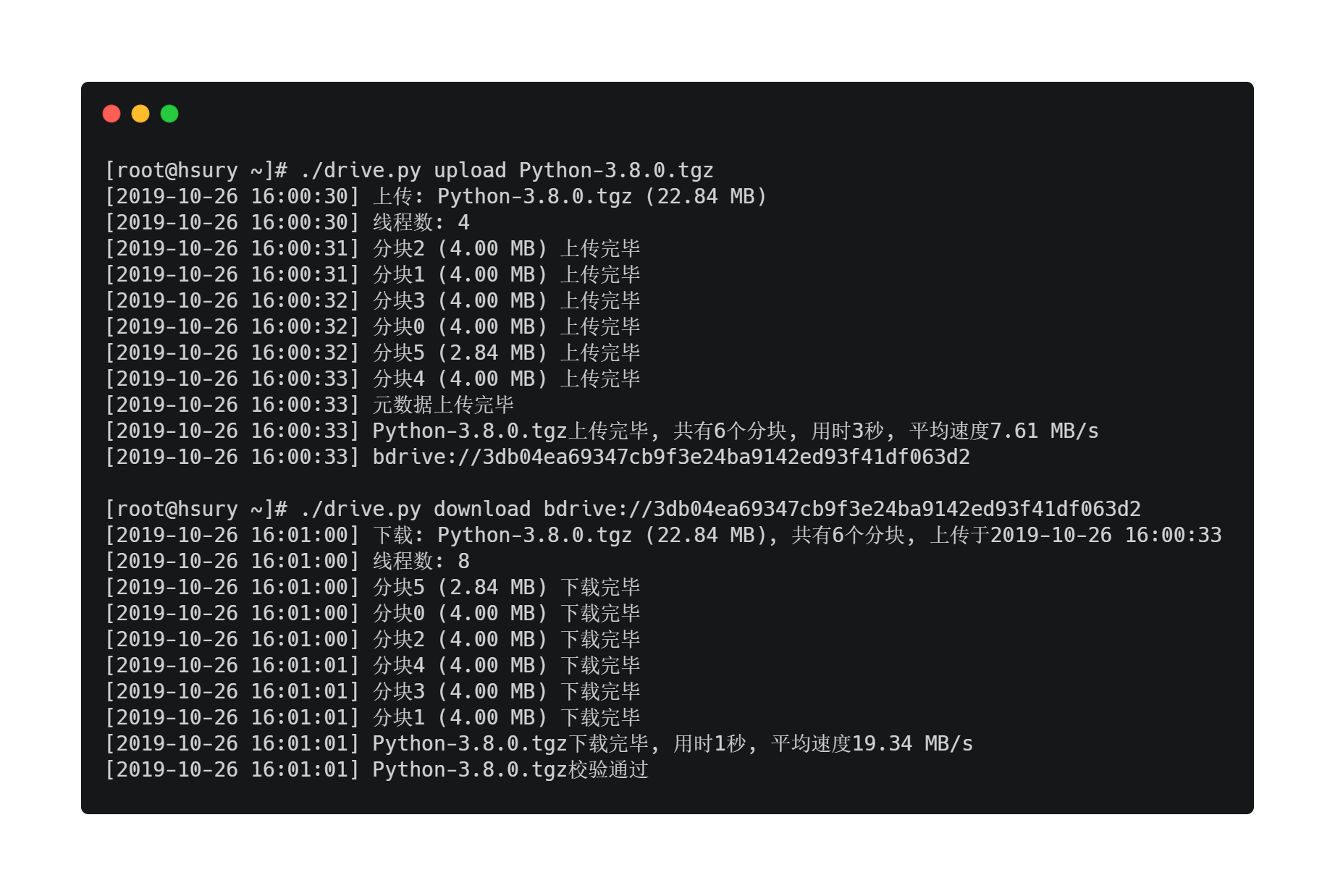 轻量:无复杂依赖,资源占用少自由:无文件格式与大小限制,无容量限制安全:上传的文件需要通过生成的META URL才能访问,他人无法随意查看稳定:带有分块校验与超时重试机制,在较差的网络环境中依然能确保文件的完整性快速:支持多线程传输与断点续传,同时借助B站的CDN资源,能最大化地利用网络环境进行上传与下载
