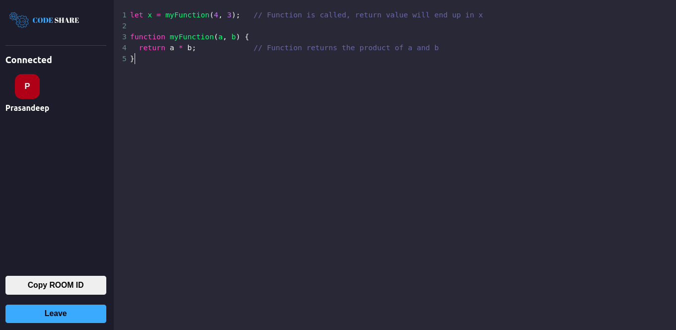 - Joined users can copy room id for sharing same id with other to join coding share enviroment.