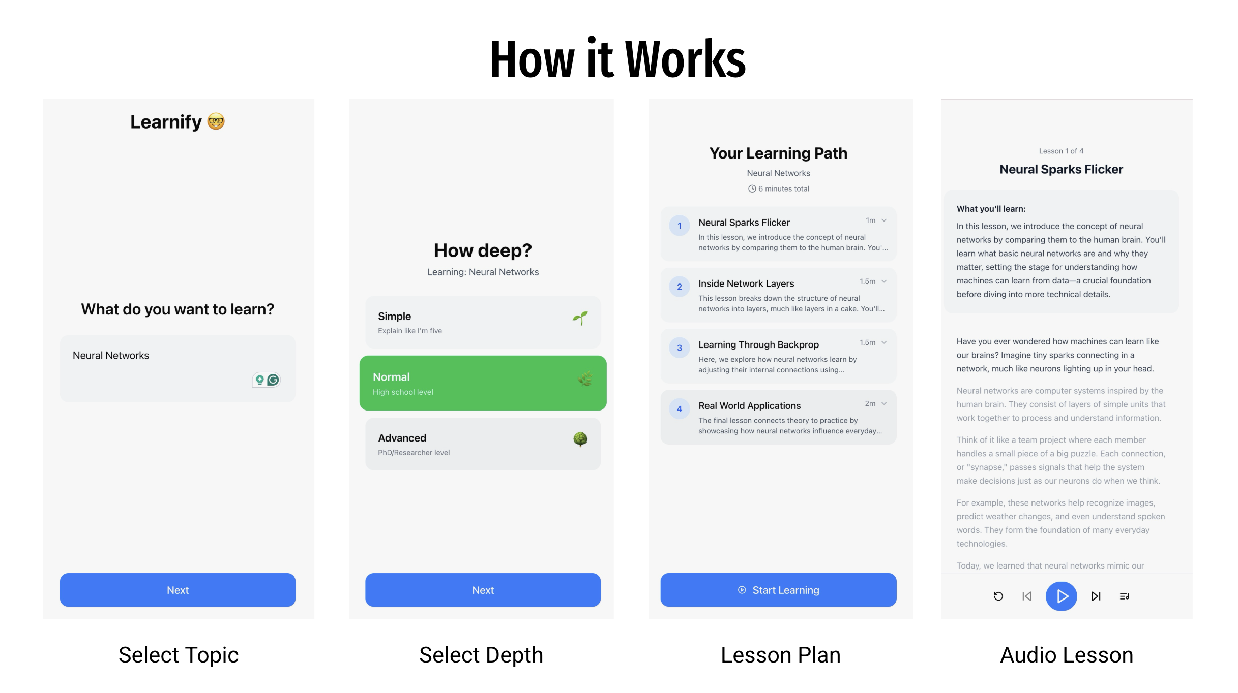 Learnify transforms any topic into bite-sized, engaging audio lessons (3-5 minutes each) using AI. Whether you're learning quantum physics or cooking techniques, Learnify adapts to your knowledge level and delivers personalized content you can listen to anywhere.