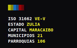 Muestra información sobre el territorio Venezolano. uso $ npm install -g venezuela $ venezuela --ayuda ejemplo $ venezuela Zulia documentación Documentación del API licencia Licencia MIT ©️ 2018 Jobsamuel Núñez
