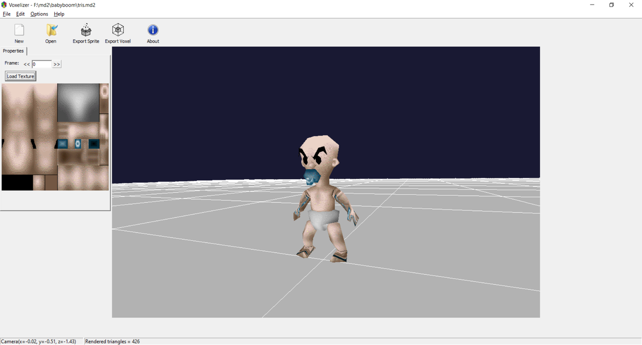 Voxelizer Features Export md2 models as voxels (sLab6's vox and DelphiDoom's ddvox formats) Export md2 models as Doom sprites Downloads version 1.0.4.32 (20211203 - win32) version 1.0.3.31 (20211117 - win32) version 1.0.2.29 (20210427 - win32) version 1.0.1.28 (20210427 - win32) Screenshots