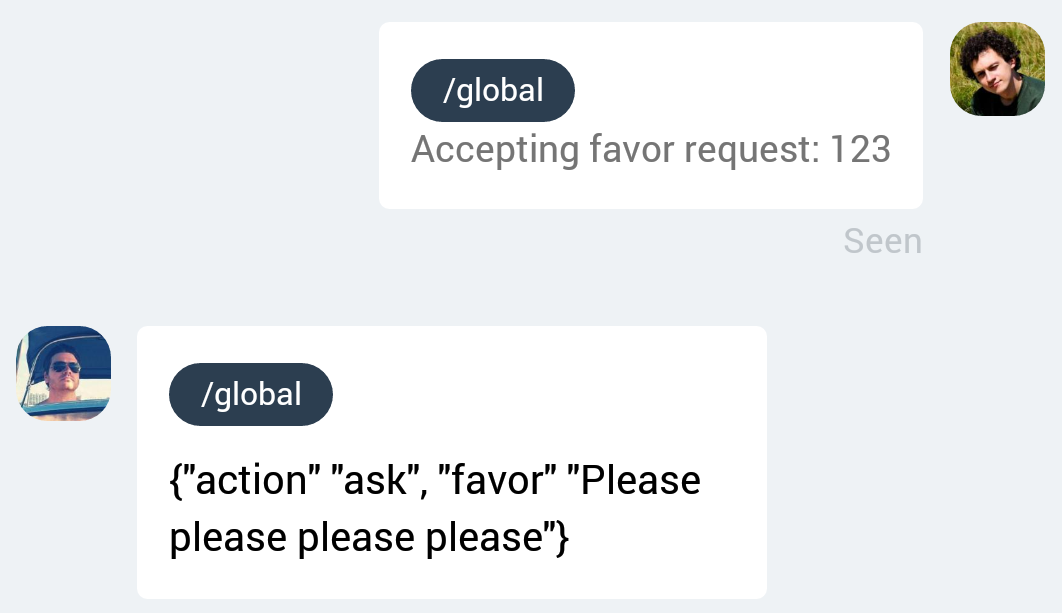 Lastly global commands cannot be currently used as response requests. It would be nice to support this use case because then in the below example my speech bubble that asks the other side for a favor could at the same time provide the @favor accept button to have the remote party accept it.