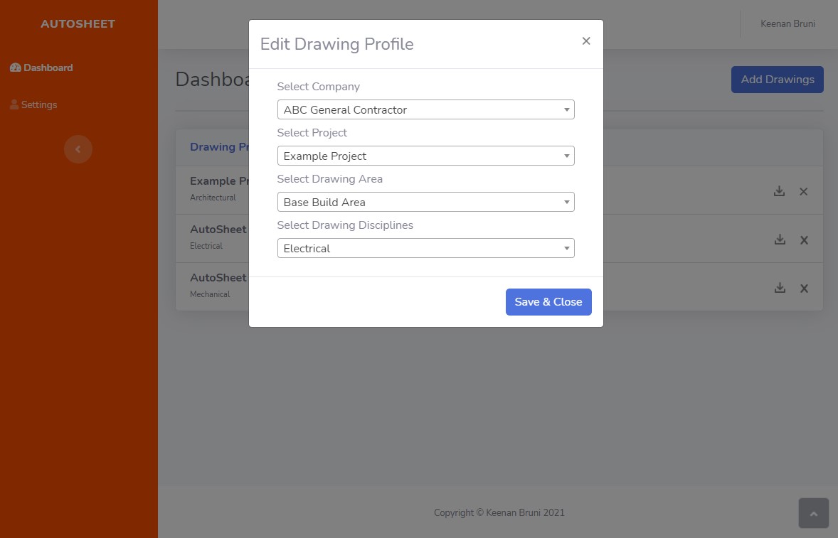 The Autosheet dashboard displays a brief summary of existing drawing sync profiles. From this page the user has the option to add a new sync profile, edit an existing profile, or logout.