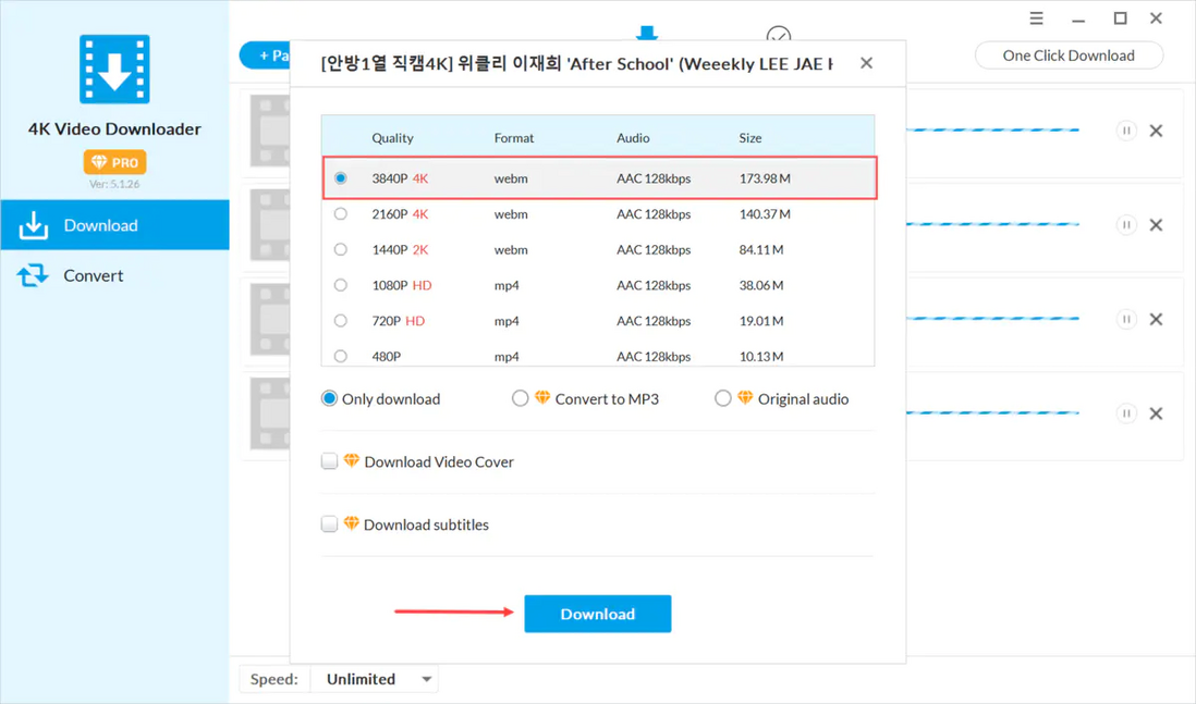 4K Video Downloader 是由Jihosoft团队开发的一款功能强大的YouTube视频下载软件 (油管视频下载工具) 主要用于帮助用户下载YouTube, Facebook, Twitter, Instagram, Vimeo, Dailymotion, TED, Twitch,Naver TV, Bilibili等国内外网站上的视频, 音乐, 频道, 和播放列表。该软件设计简单, 集多种功能于一体,除了下载YouTube视频, 它可以批量将在线或本地YouTube视频转换成MP3, MP4, MOV, MKV, AVI, M4A, WEBM等格式。