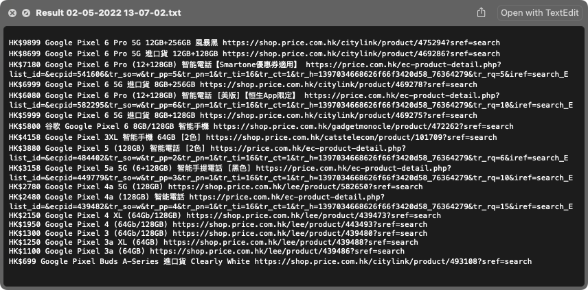Finding the best deal on the web online section(網購) of Price.com.hk of your desired product, saving you time from going through all pages on the website just to look for the cheapest offering. Soldout items are all ignored as well. You can Hold Cmd (macOS)/Ctrl (Windows) and click on each result inside the terminal, the browser will be opened and redirect to the item's page on Price.com.hk.