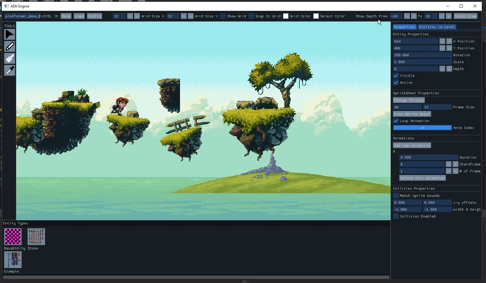Ayax Development Kit is a collection of tools and resources that one would want in order to create a 2D video game. In essence, ADK is an easy-to-use C++ game engine for building modern 2D games, but it includes several useful game systems such as character controllers, cameras, and common game objects such as trigger boxes. ADK also includes a demo platformer game to study. Whether you take one of the example/demo games and expand upon it or decide to create a new game using the integrated editor, ADK provides the features you need.