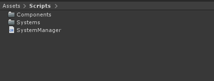 The Scripts folder is divided into two sub-folders. One for Components, which are simply containers for data, and the other for Systems which perform the functionality. The SystemManager script is used as a Bootstrap script.