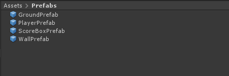 The Prefabs folder contains prefabs for the environment objects, Player, and ScoreBox.