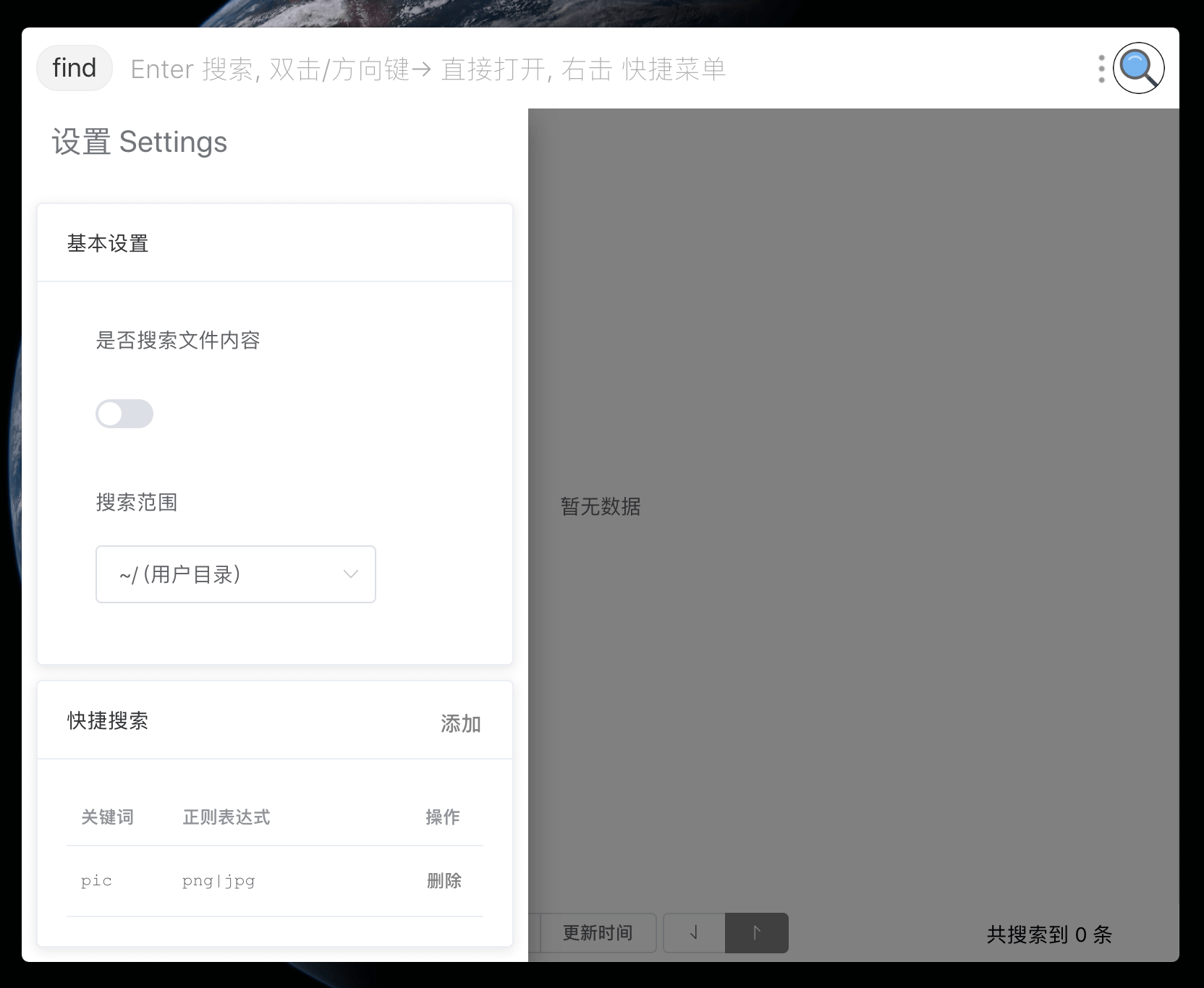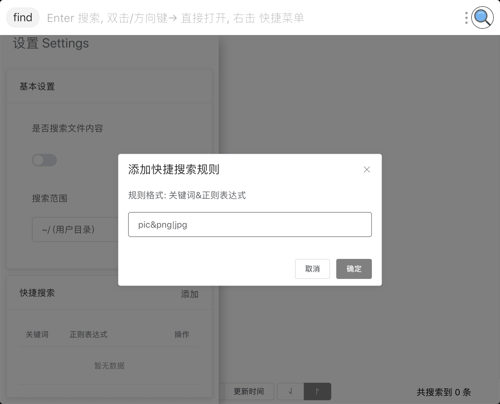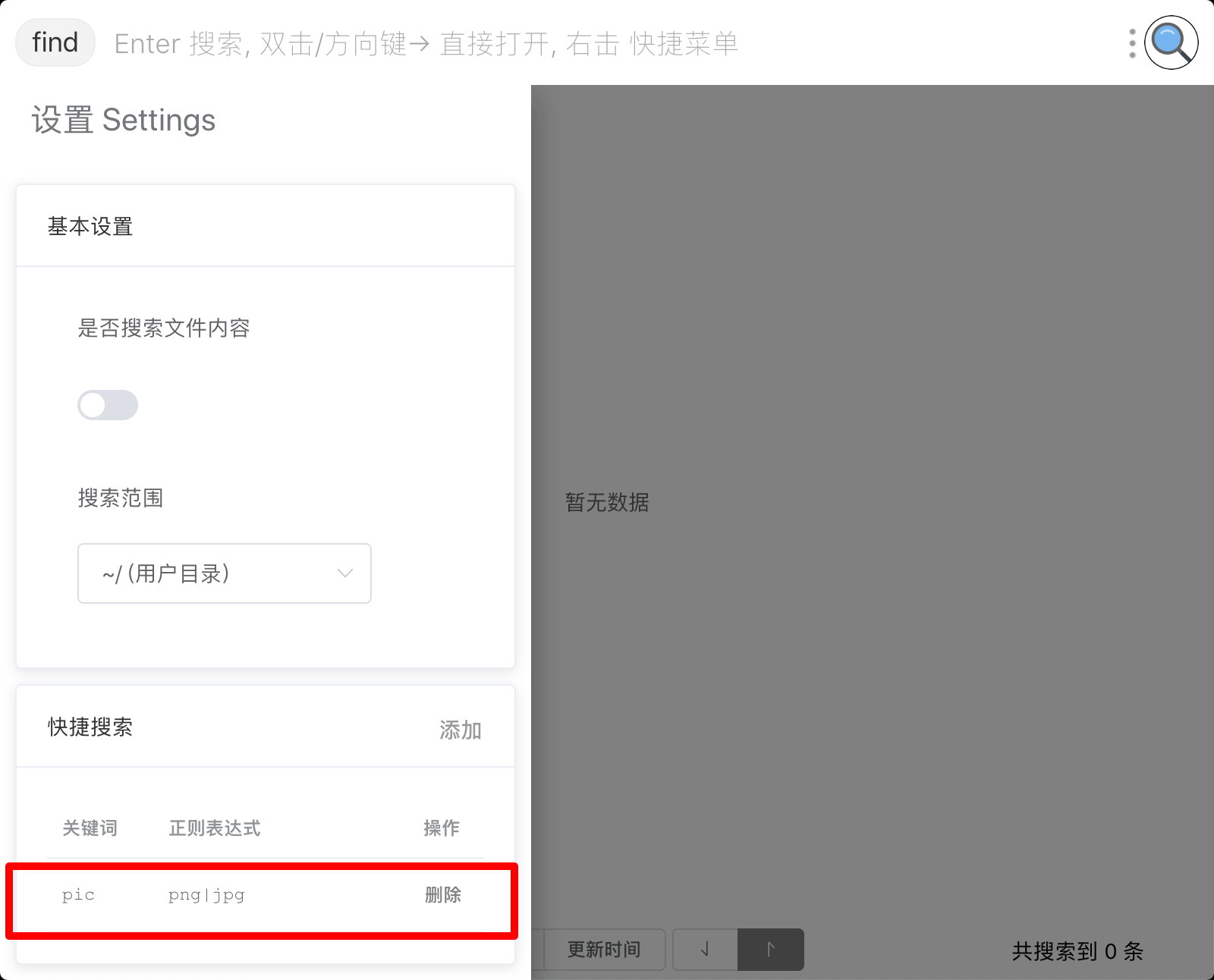 如果我想要在搜索结果里面过滤出图片文件, 那么可以在自定义快捷搜索里面添加: pic&png|jpg|jpeg|bmp|svg|webp$, 其中以&作为分隔符, pic是快捷搜索时使用的关键字, \.(png|jpg|jpeg|bmp|svg|webp)$为执行快捷搜索时使用的正则表达式