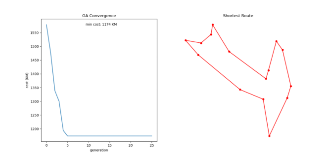 This repository contains a generic Python implementation of a Genetic Algorithm to solve the Travelling Salesman Problem (TSP). Geographic coordinates of cities are provided as input to generate a edge-weighted complete graph where the weights are the distance between the cities in kilometers.