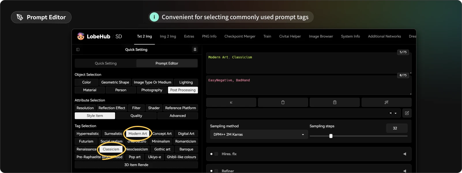 A user-friendly prompt word editor has been added to the second tab of the quick setting menu. It includes a series of preset tags covering post-processing, style description, and other key words, simplifying your operation process and helping you edit and manage prompts more efficiently.