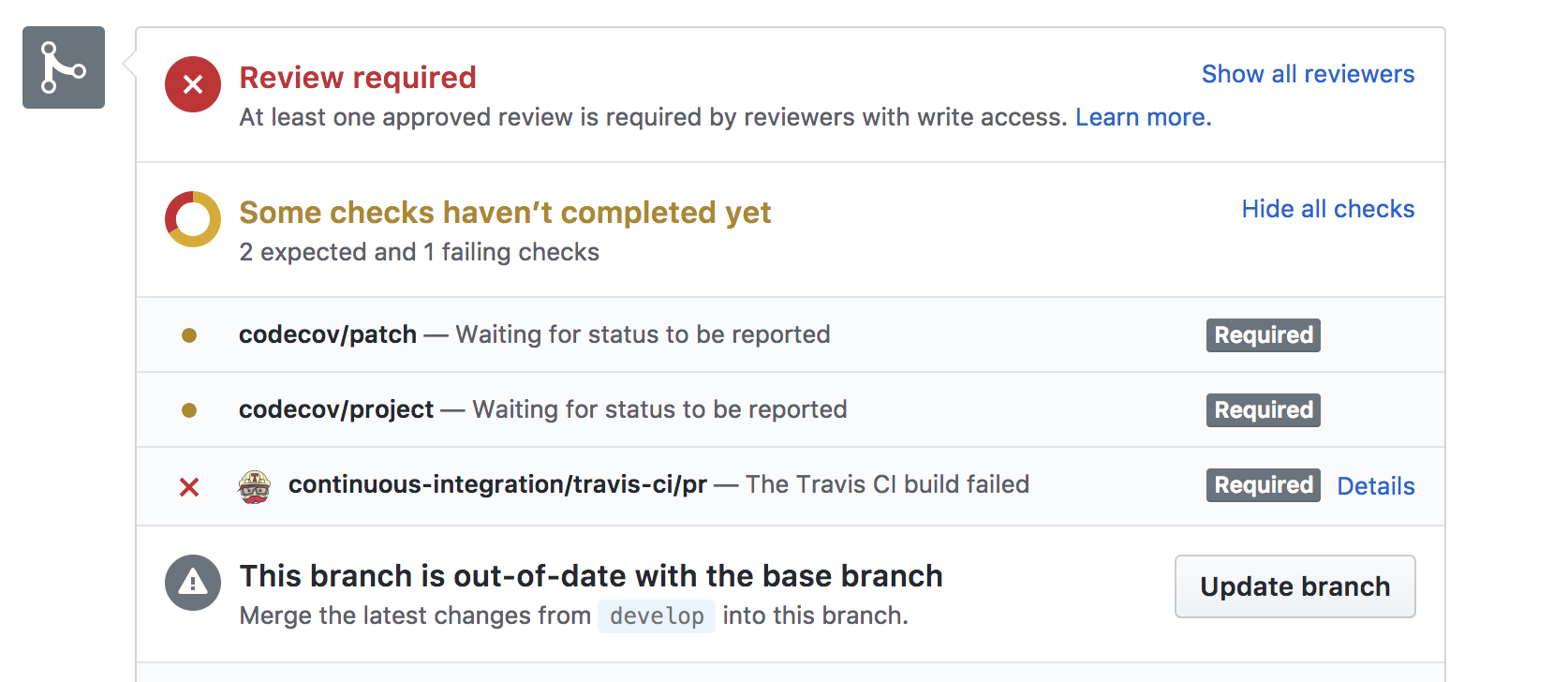 Below is an example of a stale PR, with failing Travis CI. Click the Details link to see what's going on with Travis CI.