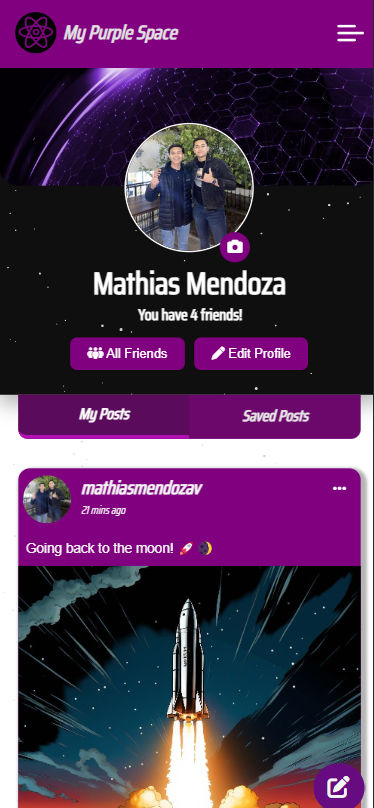 Welcome to My Purple Space, a social media app built with React.js, Supabase, and vanilla CSS. This app allows users to create accounts using their email addresses and set up passwords. Once logged in, users can explore various sections within the app, each offering unique functionalities to enhance their social media experience. ๐๐ฎ๐