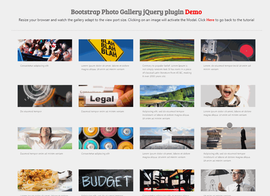 Update 11/14/2015: This code for this tutorial have been converted into a jQuery plugin. This means that it's now easier to create a responsive photo gallery. The original tutorial is still available below (where is says "Original Tutorial"). Note that you don't need to follow it if you're using the plugin. But it's good to know the inner workings of Bootstrap regardless.