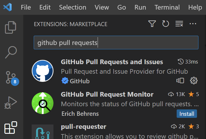 in the menu bar on the left, and search for "Github Pull Requests and Issues".