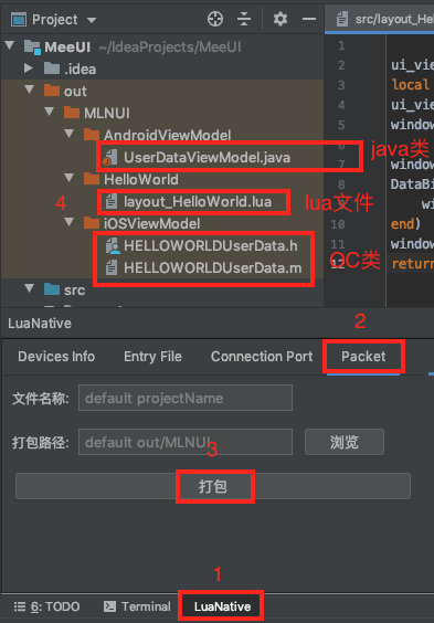 打包成功后,会在工程目录中生成对应的lua文件和OC类及java类。