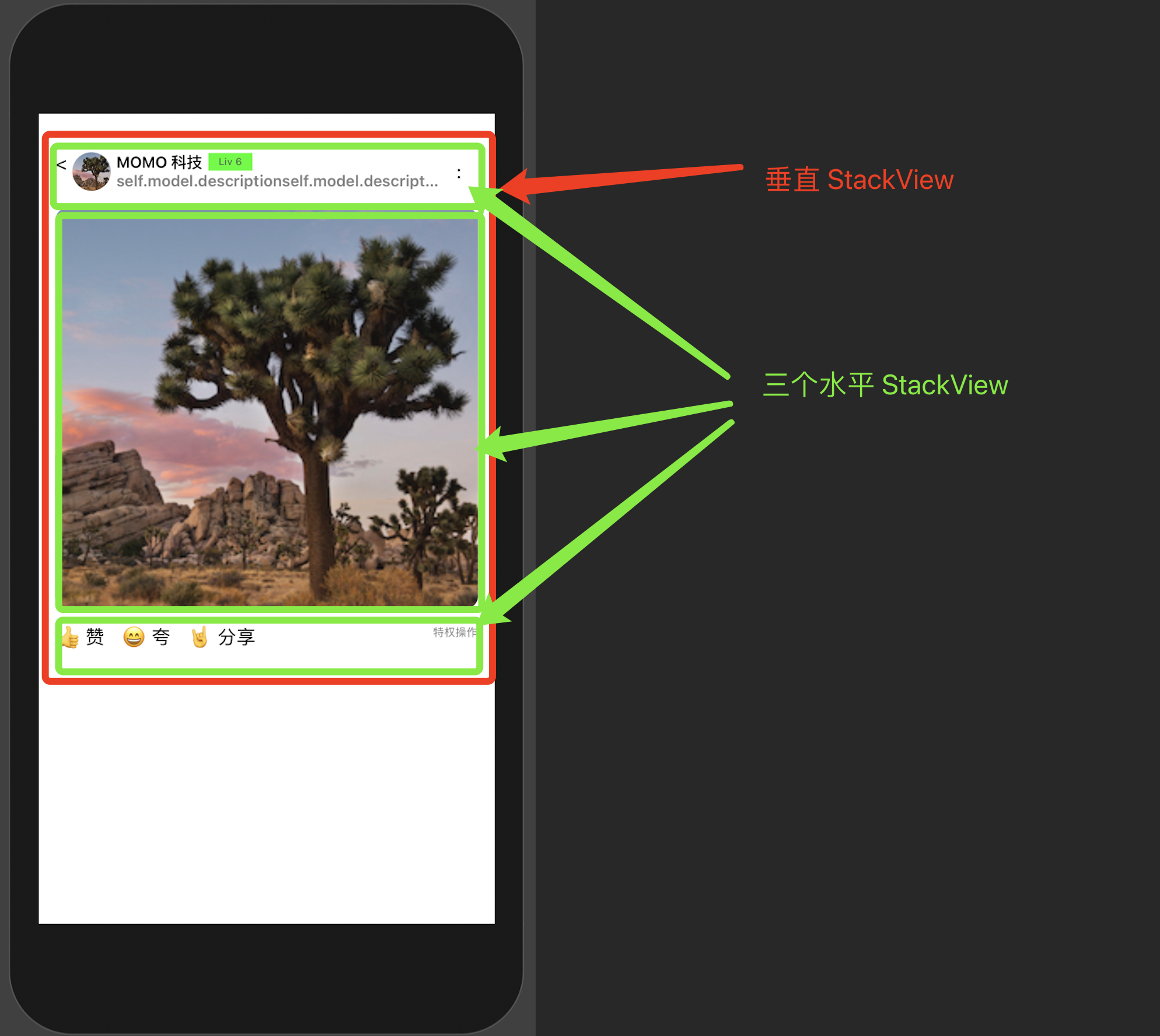如果要把要做的效果图通过 UIStackView 来实现,我们大致应该这样做: