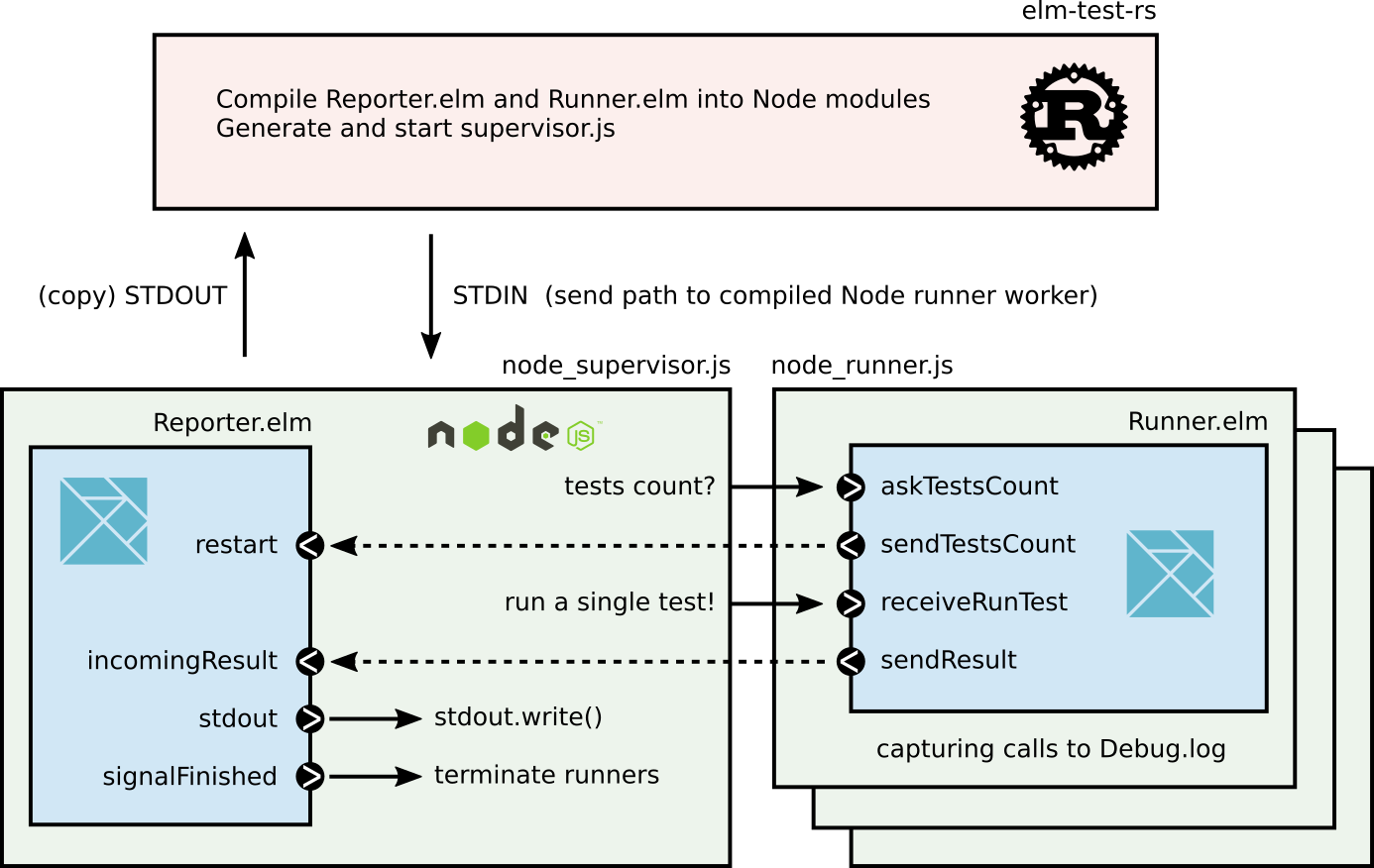 - The supervisor, a small Node JS script (roughly 100 lines, no dependency other than Node itself) tasked to spawn runners (Elm), start a reporter (Elm) and transfer tests results from the runners to the reporter.