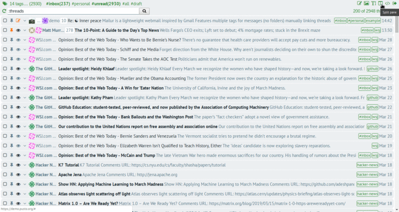[Nowadays]On pause...[May 2020]Two-way syncing for five Gmail flags and labels (details here #13)[Mar 2019]Feature overview.[Mar 2019]Dovecot as main storage.[Nov 2015]codeThe alpha version. Postgres based. We used it over 2 years on daily basis.[Apr 2014]codeThe first prototype.