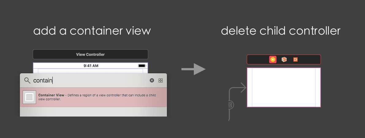 - In Interface Builder, create a container view in your ViewController and then delete its child from the storyboard: