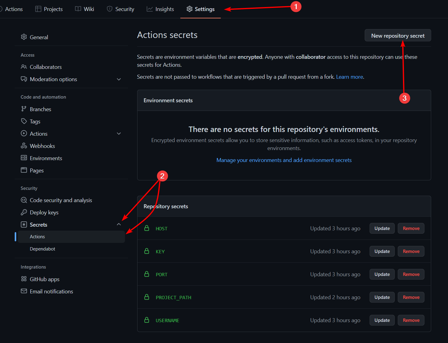 you should configure github actions secrets on https://github.com/<username>/<repo>/settings/secrets/actions