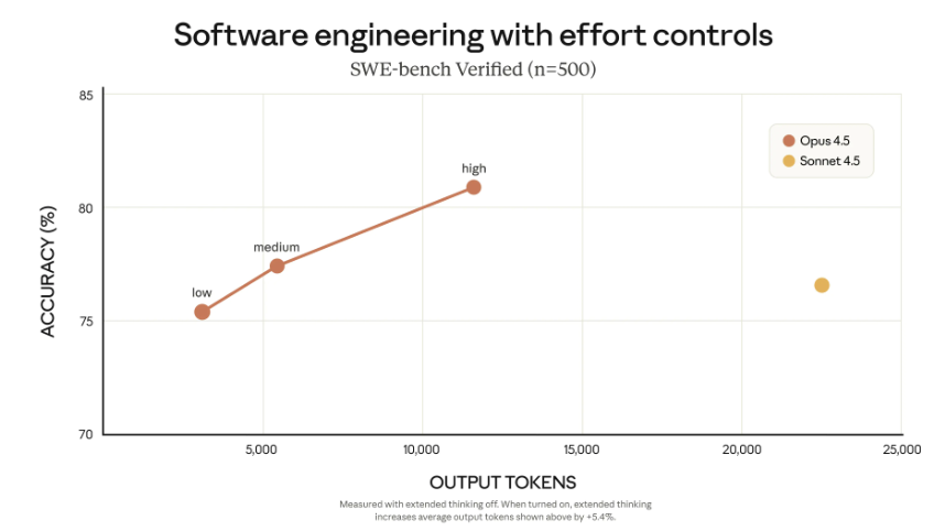 在编码任务中,以「中等 Effort」模式,Opus 4.5 在 SWE-bench 上匹配 Sonnet 4.5 最佳成绩,但使用约 76% 更少的输出 tokens。以「高 Effort」模式,超过 Sonnet 4.5 约 4.3 个百分点,同时输出 tokens 少约 48%。