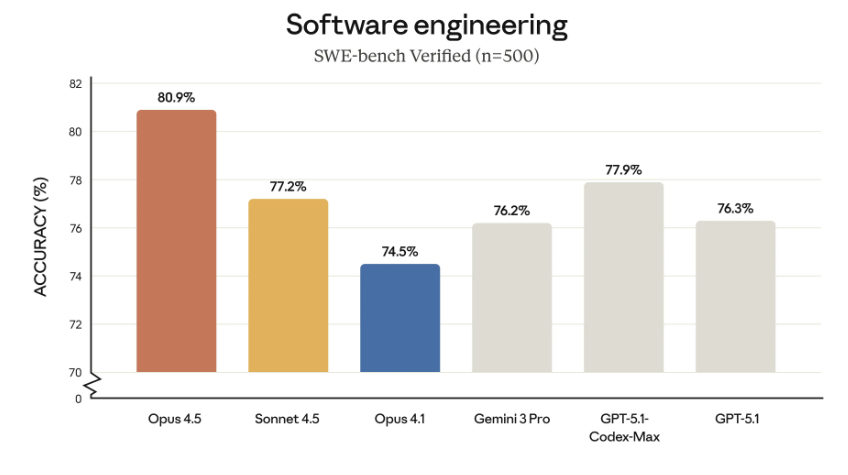 与前一代 Sonnet 4.5 相比,Opus 4.5 在编码任务上表现得更好、用 token 更少效率更高。