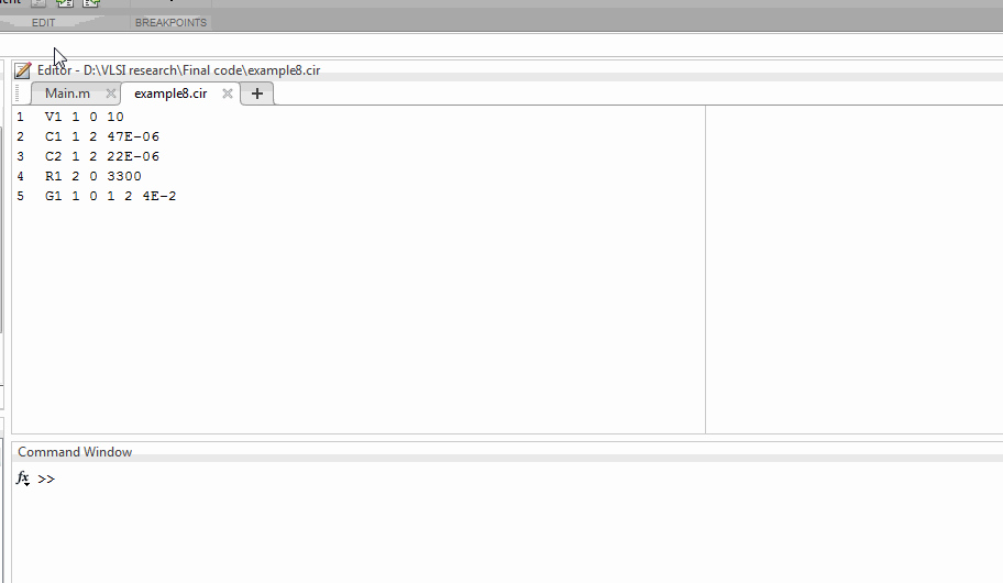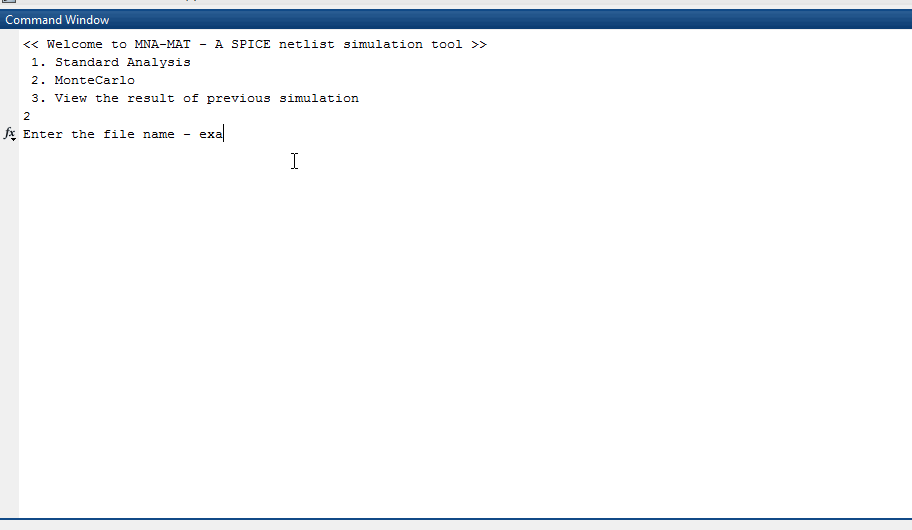 MNA-MAT is a simulation tool designed in MATLAB for solving circuits described as SPICE netlists. It uses the algorithm of Modified Nodal Analysis (MNA). It accepts a file (.cir or .txt) with the SPICE netlist description of the circuit to be simulated. As of now, MNA-MAT supports the following circuit elements :-