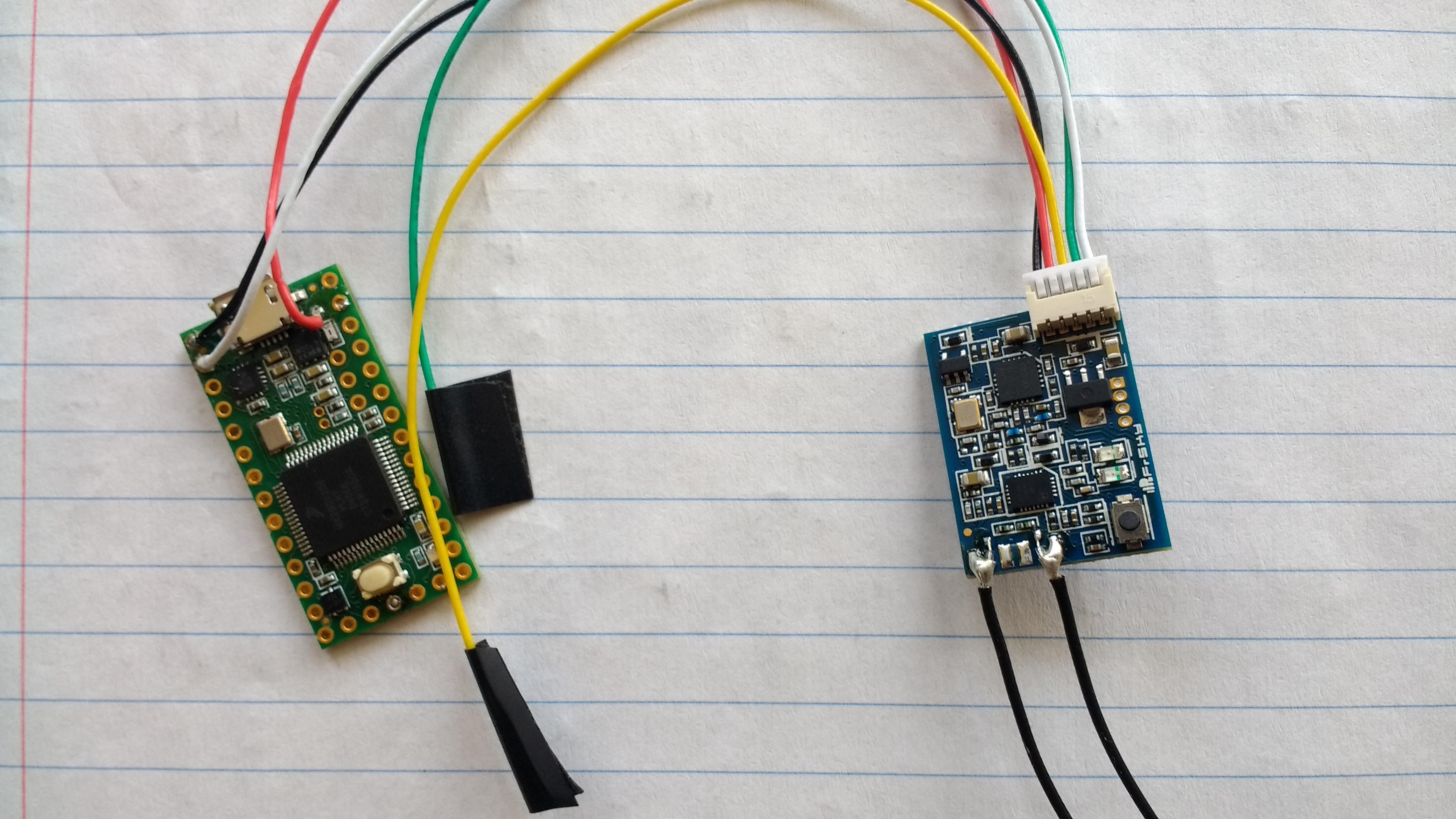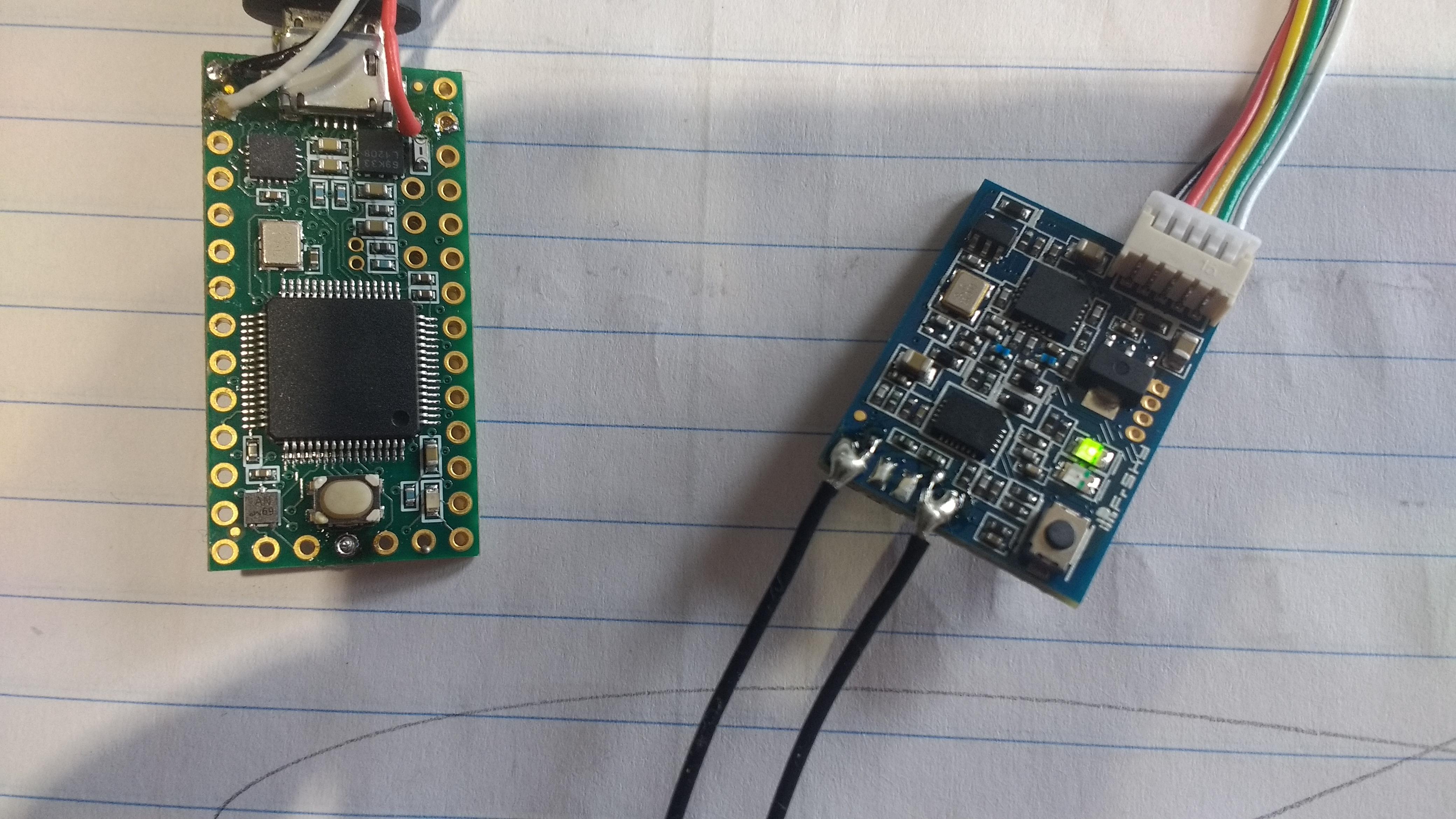 The Teensy 3.2 (left) connected to the XSR reciever (right):