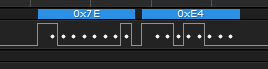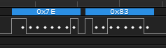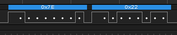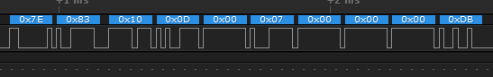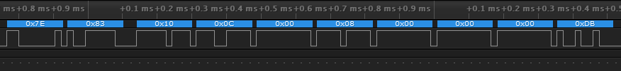 The following screenshots are snippets from the above logic analyzer setup reading the voltage on the SPORT line during the execution of a past version of the program. In the current implementation of joy, the only sensor which the Teensy responds to is 0x22 and not 0x83.