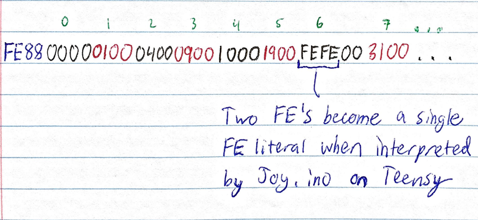 A valid packet needs to begin with the header byte 0x88, but it needs to have the escape byte 0xFE preceeding it to differentiate it from the number 136. With this protocol, to send a literal 0xFE (254), two 0xFE's should be send one right after another which will by interpreted by the joy sketch as 254.