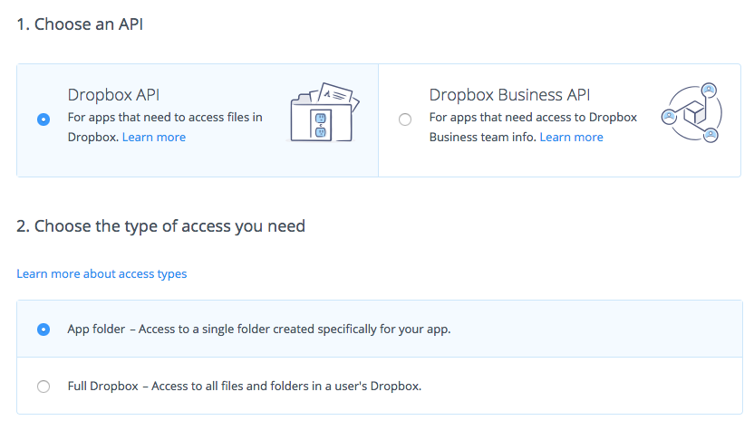 - Create an app on your https://www.dropbox.com/developers/apps/create, choose "Dropbox API", set