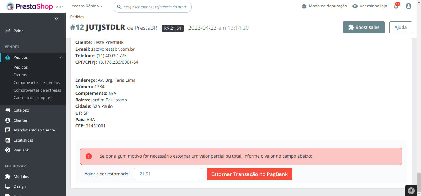 Na PrestaShop, no menu Compras ou Pedidos, acesse o pedido a ser estornado, role a página até localizar DADOS DO PEDIDO - PAGBANK. Ao clicar em Estornar Transação no PagBank, em tempo real, o módulo transmitirá a requisição para o PagBank.