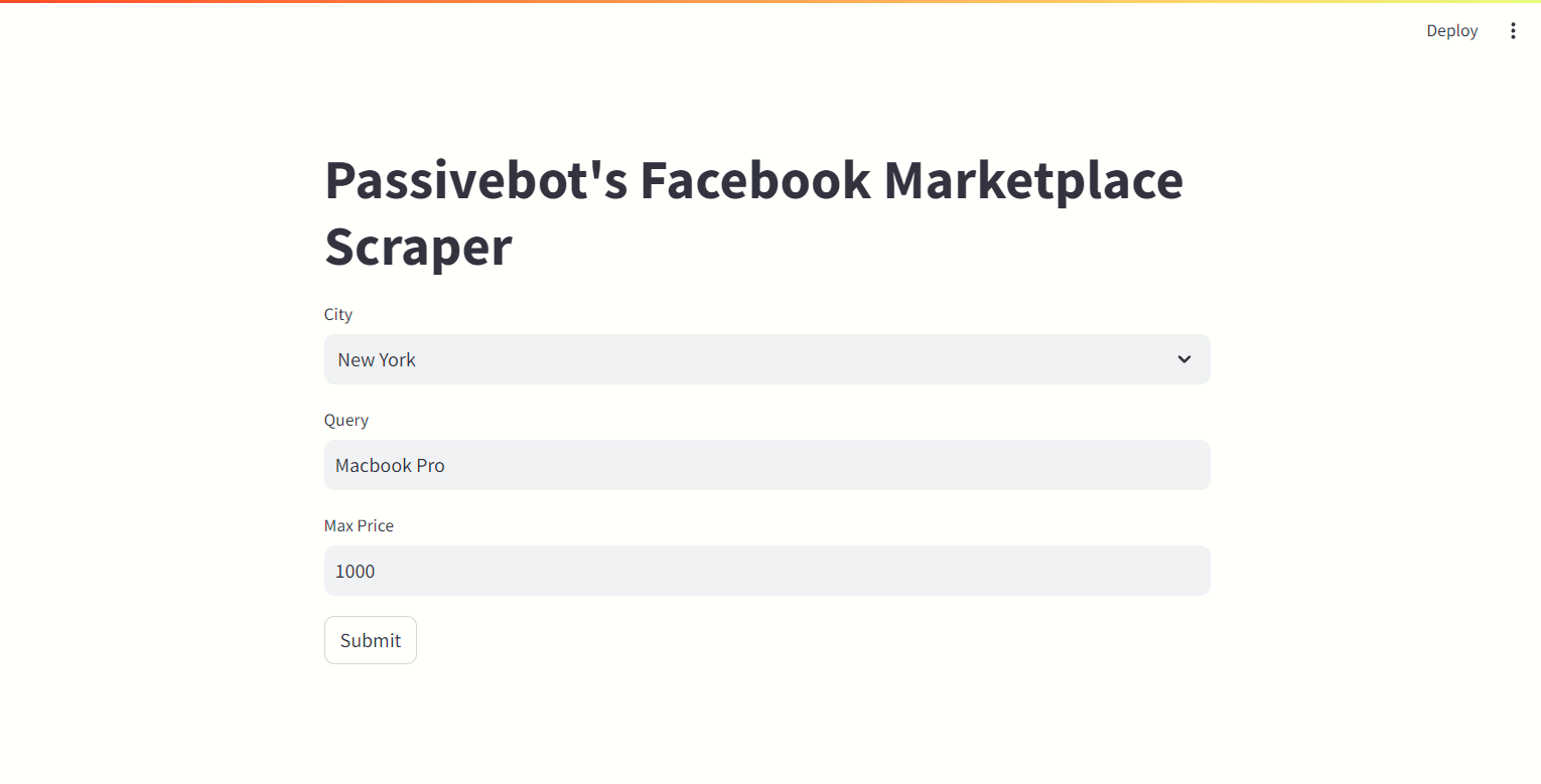 You use the software provided at your own risk. I cannot be held responsible for any potential consequences, including potential bans from Meta.This open-source program uses Python to scrape data from Facebook Marketplace. The program uses Playwright to navigate the Facebook Marketplace website and BeautifulSoup to parse the HTML and extract relevant data. It then displays the results in a Streamlit GUI.