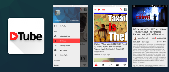 The app can be downloaded as an APK (Android Package). This is a standard application package format than many of you already know about. I will eventually be putting this app on places like XDA Labs and Aptoide. Currently you can find the app on the Github Release Page . Just download the app-release.apk to your phone. Next make sure you have Unknown Sources enabled on your phone. Go to your phone settings > Lock Screen and Security (or just Security depending on your phone firmware) > Check the box that says Unknown Sources. This will allow you to install apps outside the Play Store. Now you can press on the downloaded app in your status bar and it should prompt you to install the app. Let me know if you have any problems and I can help. Press the install button and the app will be installed in a couple moments. Now the app should show up in your app drawer as D.tube.