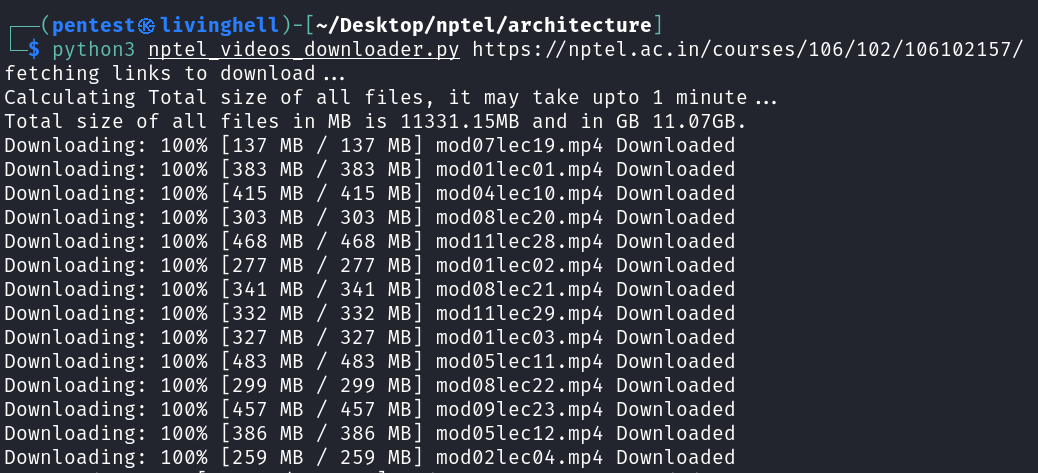 Step 6: in terminal: $ python3 nptel_videos_downloader.py https://nptel.ac.in/courses/128108016/ --videos/--assignments