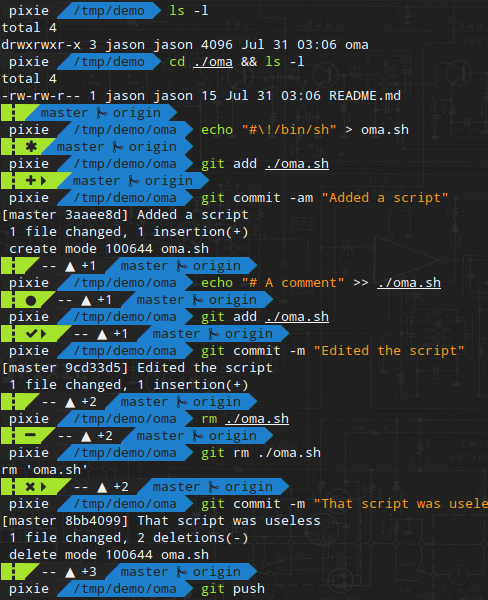 - When you are into a git repo, a second line will be displayed, showing the git status, divided in 3 parts: local, commit, remote