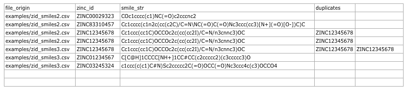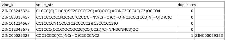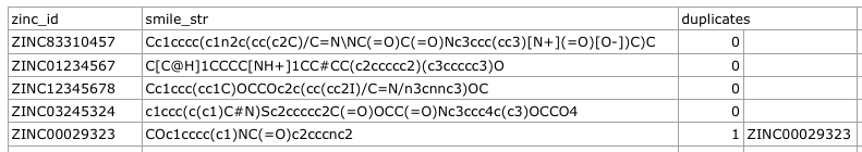 - 4th-nth column: ZINC IDs of duplicates