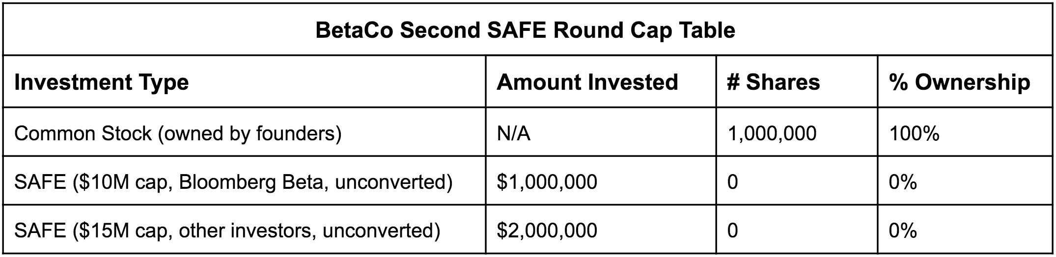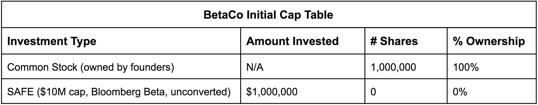 For example, imagine we make the very first investment in BetaCo using a $1M SAFE on a $10M post-money cap (with a target ownership of 10%). The initial cap table now looks like this: