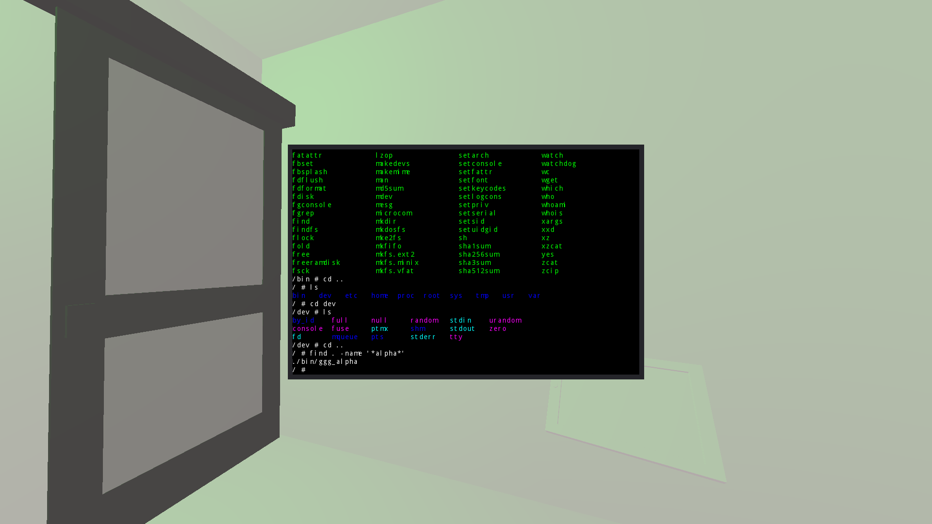 Level 3, "Find alpha": Key is hidden in /bin/key_alpha, it is 78963, so echo 78963 > /dev/by_id/door/in